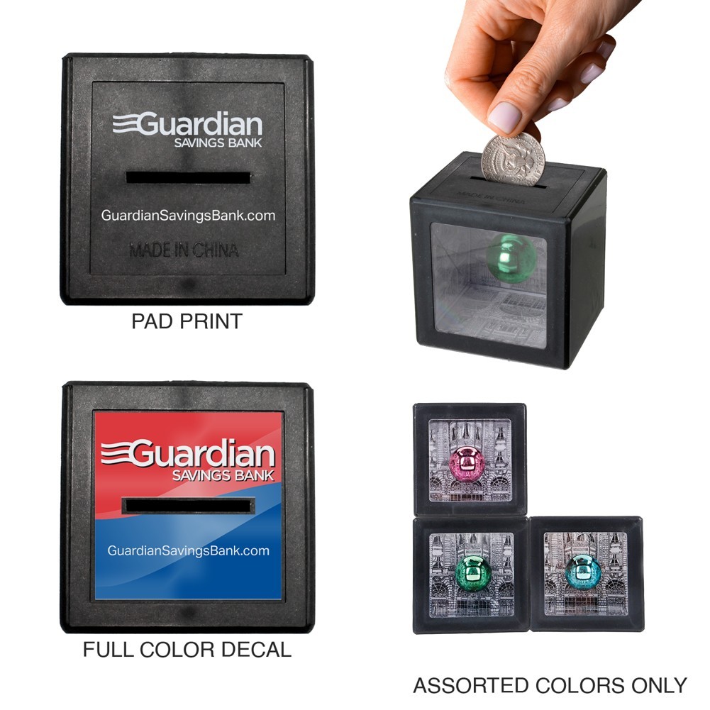 Pad Printing. 1.75″ W x 1.45″ H on top of bank. Price includes 1 color, 1 side, 1 location