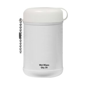 Contains 30 Wipes. Lightly Scented. Bead Chain Attachment. Meets FDA Requirements. Complies with Prop 65. 3 1/4″ W x 1 7/8″ H