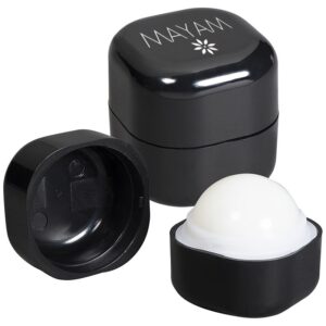 There’s no corners on this cube shaped vanilla scented lip balm. Ingredients and directions are on the bottom of the plastic case. Complies with Prop 65. 1.25″ W x 1.25″ H